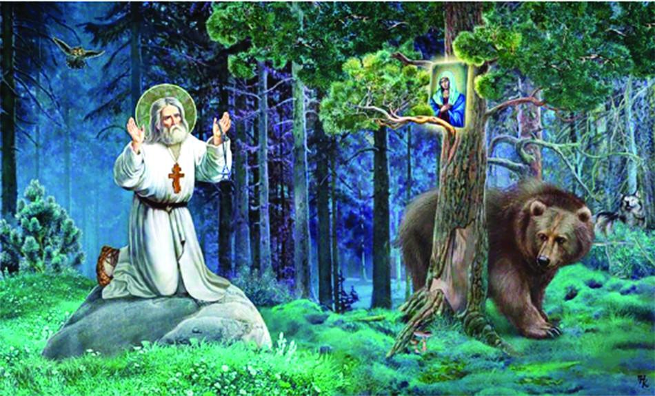Видя подвиги преподобного Серафима, враг рода человеческого вооружился против него и, желая принудить святого оставить безмолвие, решил устрашать его, но преподобный ограждал себя молитвой и силой Животворящего Креста.